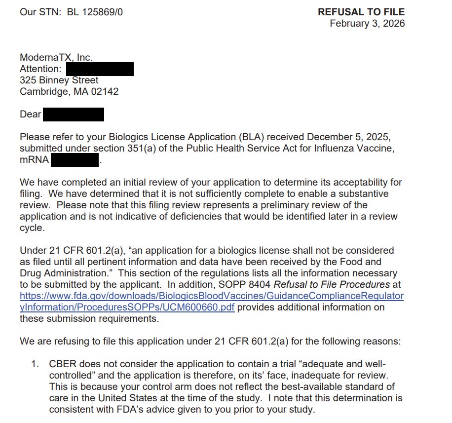 On February 3, the FDA took one of the harshest steps it can take on an application. In an unusual disclosure of what are typically confidential communications between companies and the regulator, Moderna published the refuse-to-file letter that was signed by vaccines and biologics chief Vinay Prasad. I am not sure why the mRNA name is redacted. Moderna’s public information names the flu shot as mRNA-1010: