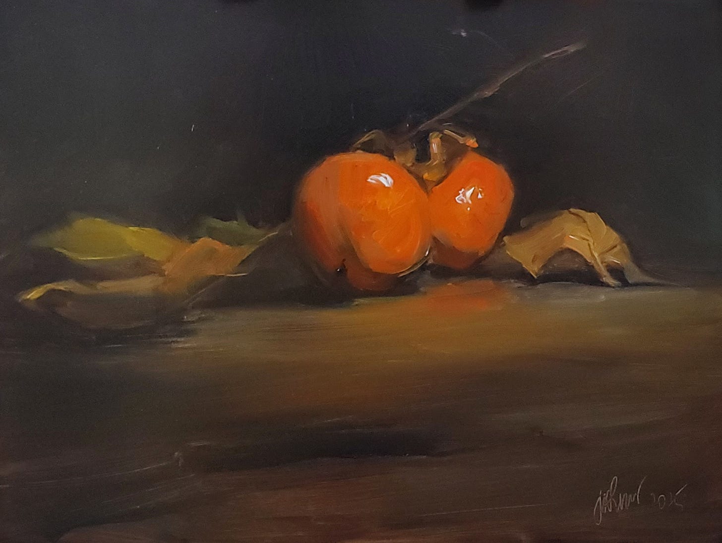 Art for today: Two Persimmons, oil on panel, 9x12 in. I have a 5 ft persimmon tree, and this year it produced an incredible amount of fruit. No idea what to do with them, but for now they make good subjects for still lives.