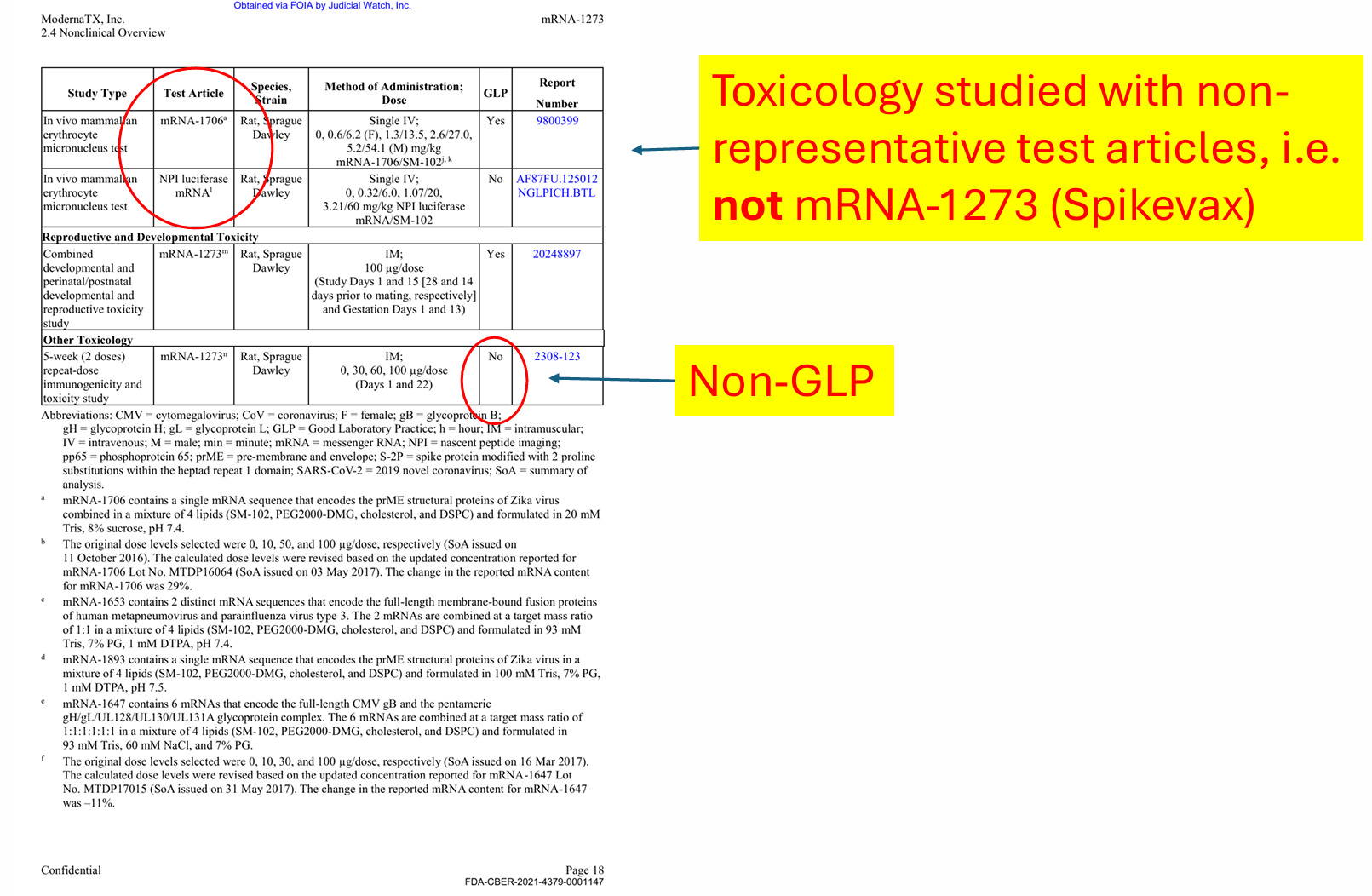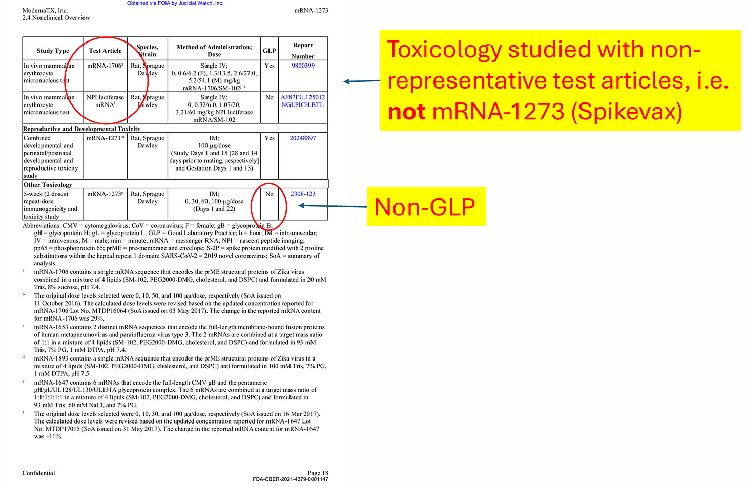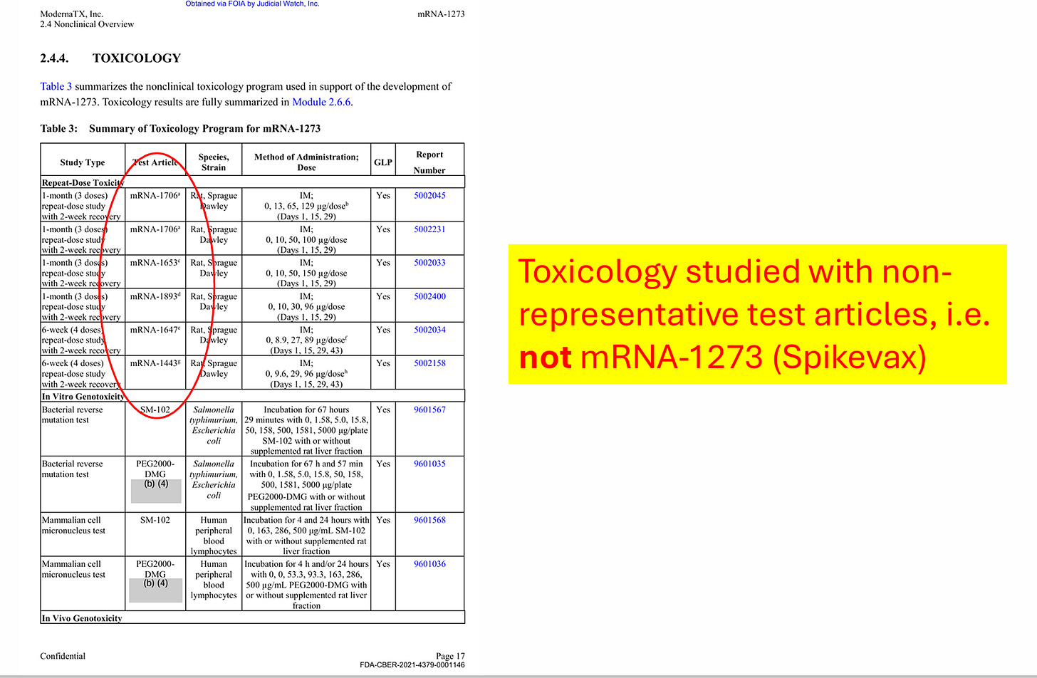 As I discuss in the video and in affidavit above, Moderna did not fulfill even minimal standards for BLA licensure. Moderna nonclinical studies amount to claiming their apple juice is organic by testing random bananas. As an example, I pulled these screenshots from the files to illustrate the deception they pulled off (as we discuss in CHD Citizen Petition, it is fraud under BLA, but fully legal under EUA):