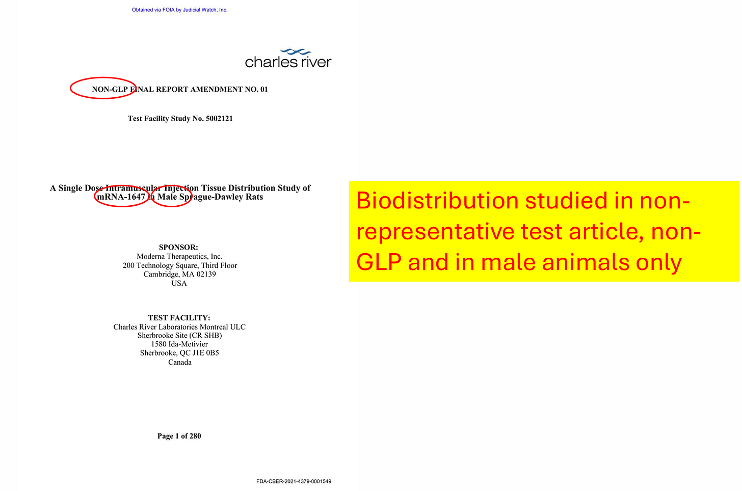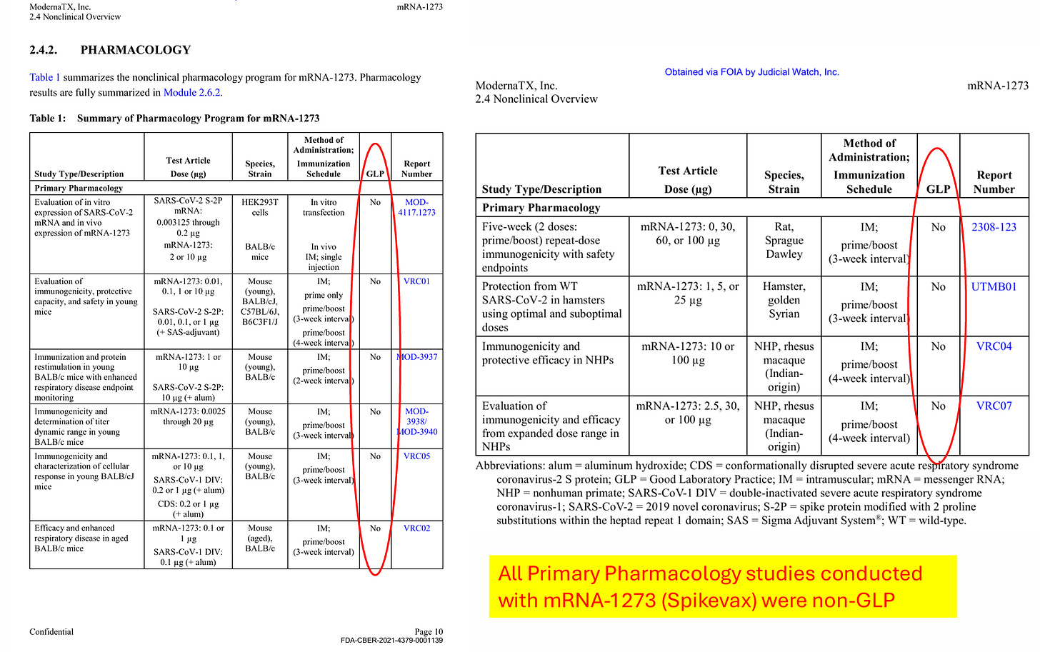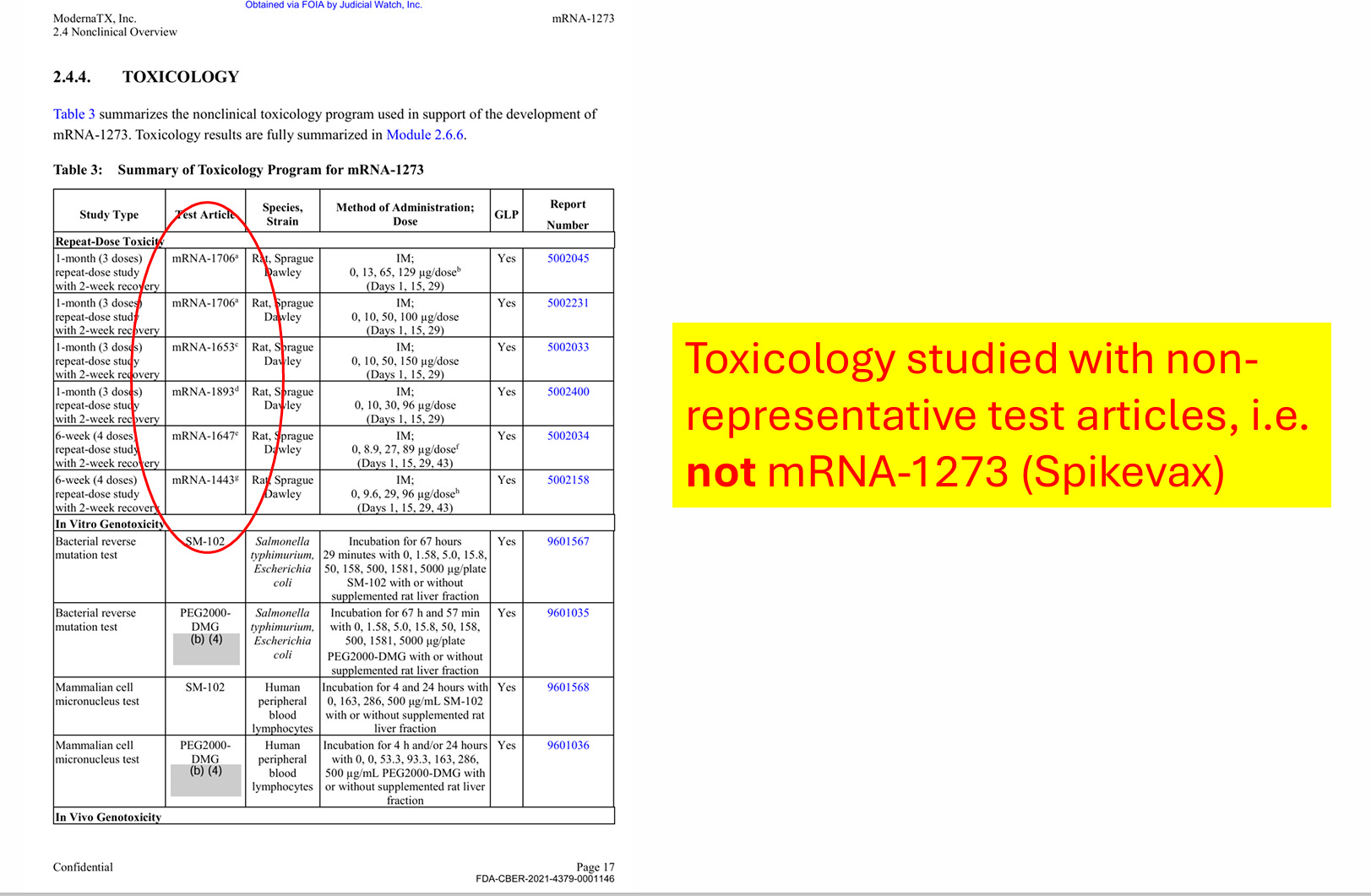 As I discuss in the video and in affidavit above, Moderna did not fulfill even minimal standards for BLA licensure. Moderna nonclinical studies amount to claiming their apple juice is organic by testing random bananas. As an example, I pulled these screenshots from the files to illustrate the deception they pulled off (as we discuss in CHD Citizen Petition, it is fraud under BLA, but fully legal under EUA):