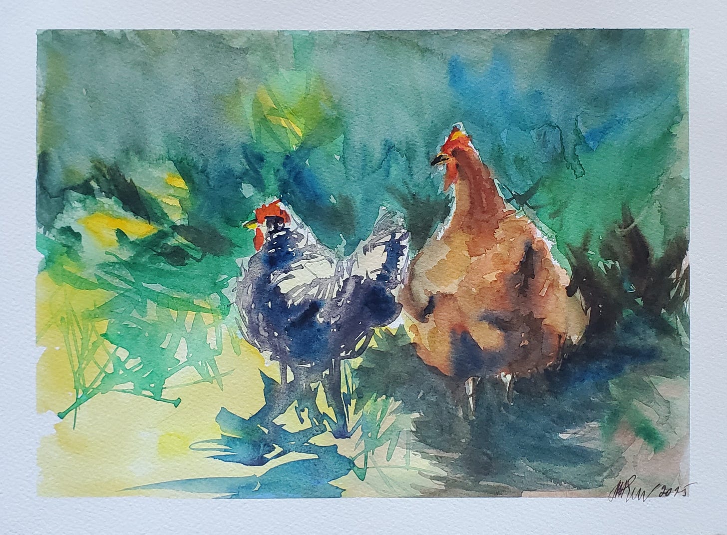 Art for today: Chicken friends, watercolor, 9x12 in.