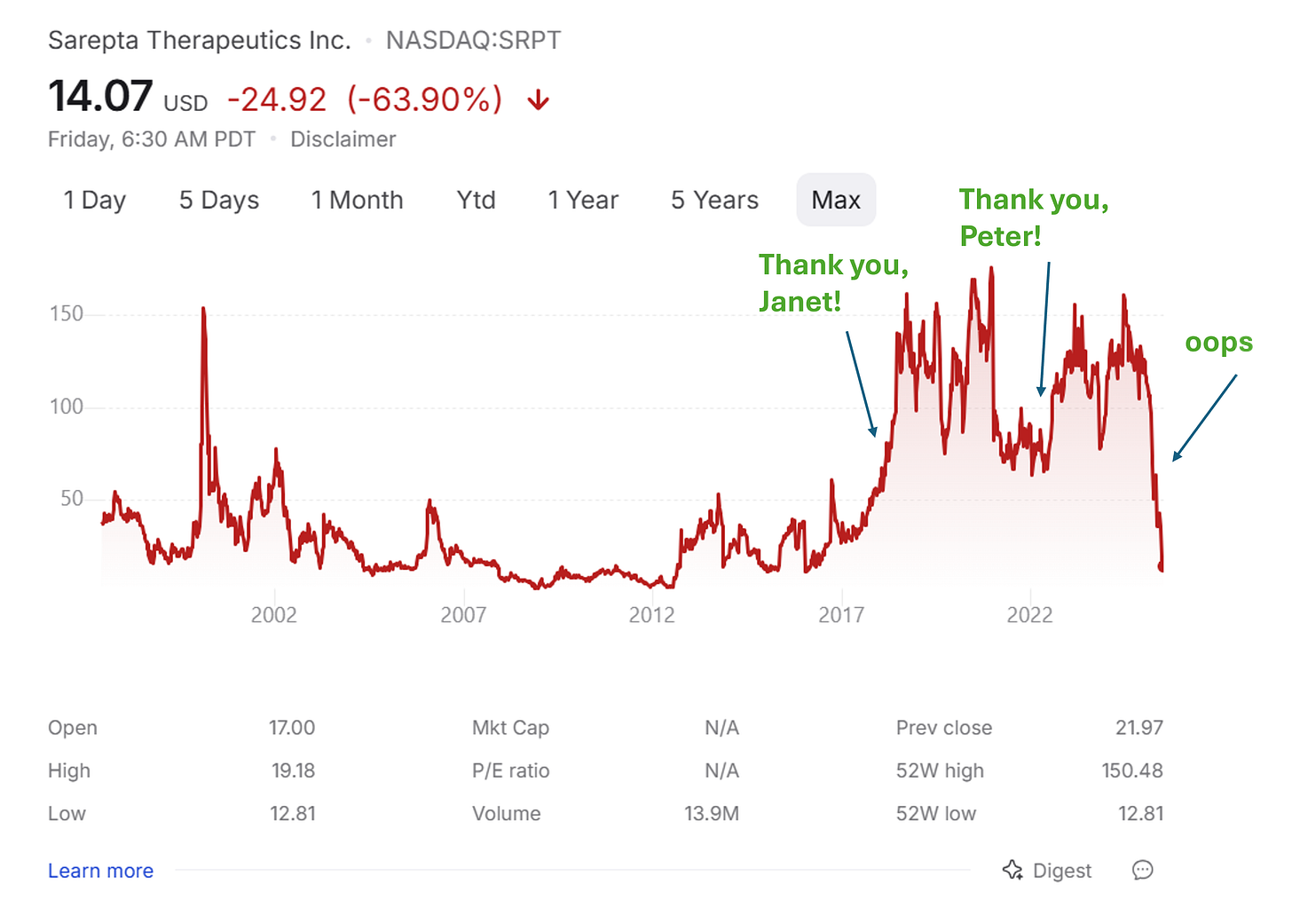 I first published about Sarepta exactly 2 years ago, in July 2023. Briefly, Sarepta is a gene therapy company, and their drug was approved by Peter Marks (former head of CBER FDA) against recommendations of all FDA review teams who did not want to approve it. This was a highly unusual move and it sparked my interest. I am republishing the story below with added commentary on what has transpired since then. This story has recently come to a head, specifically: